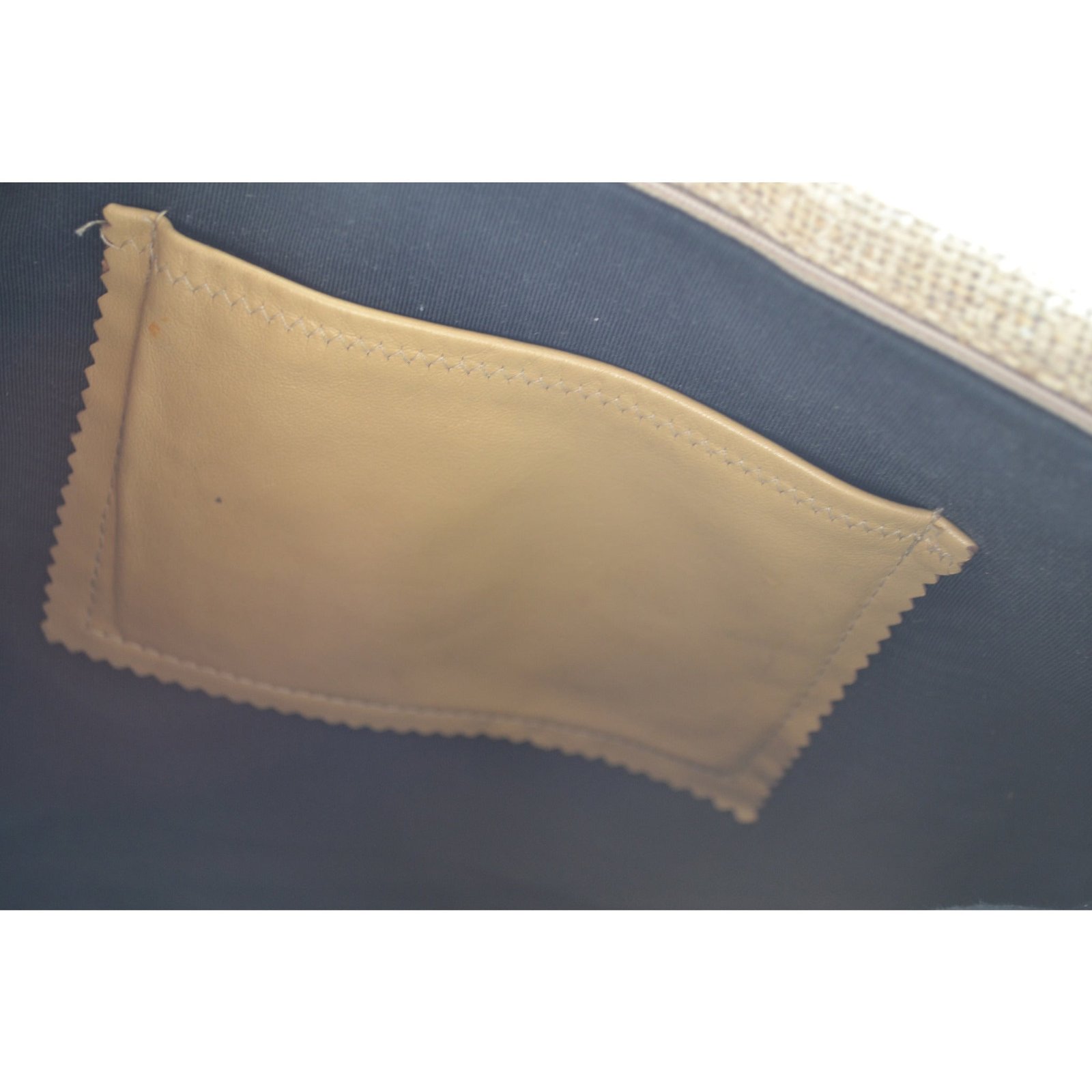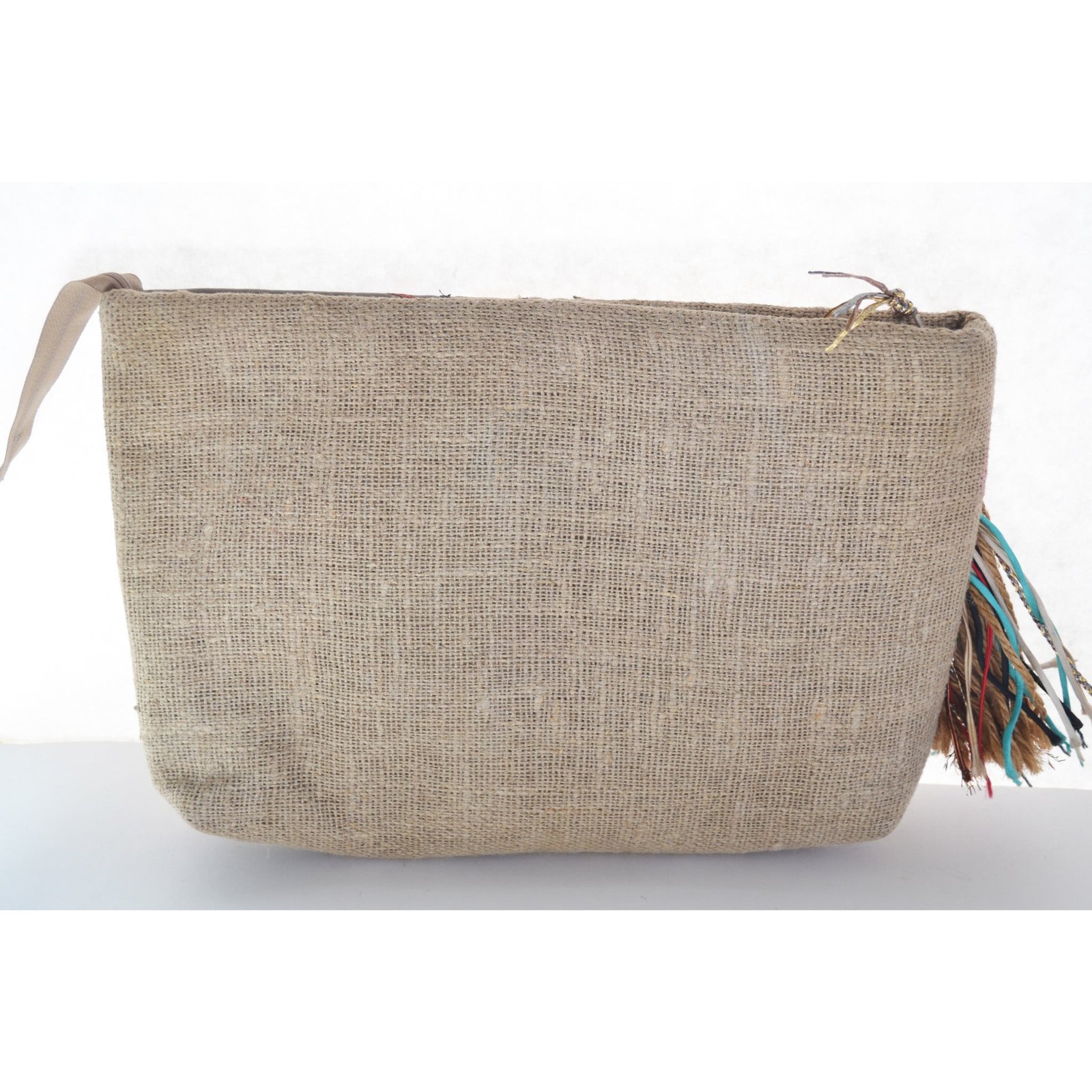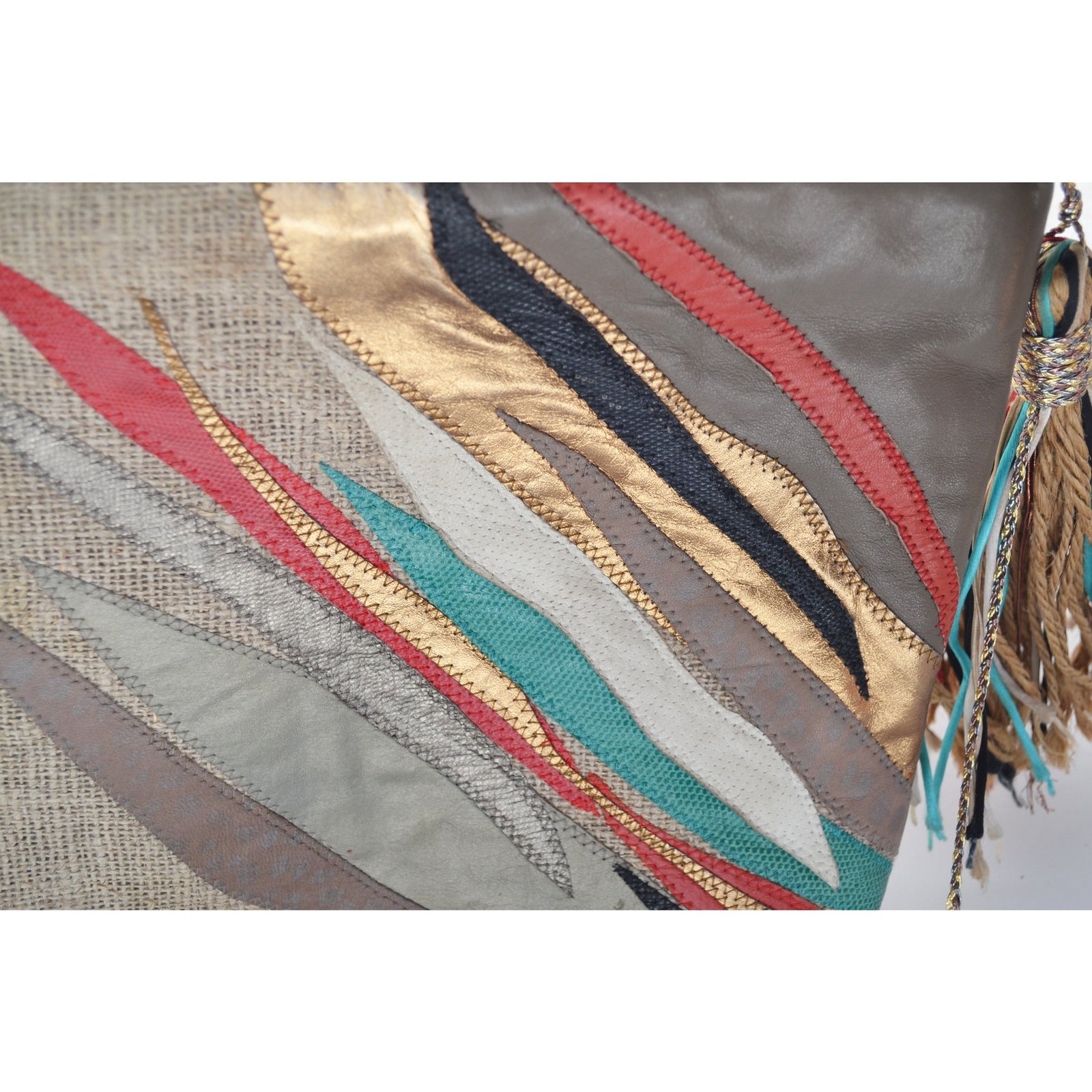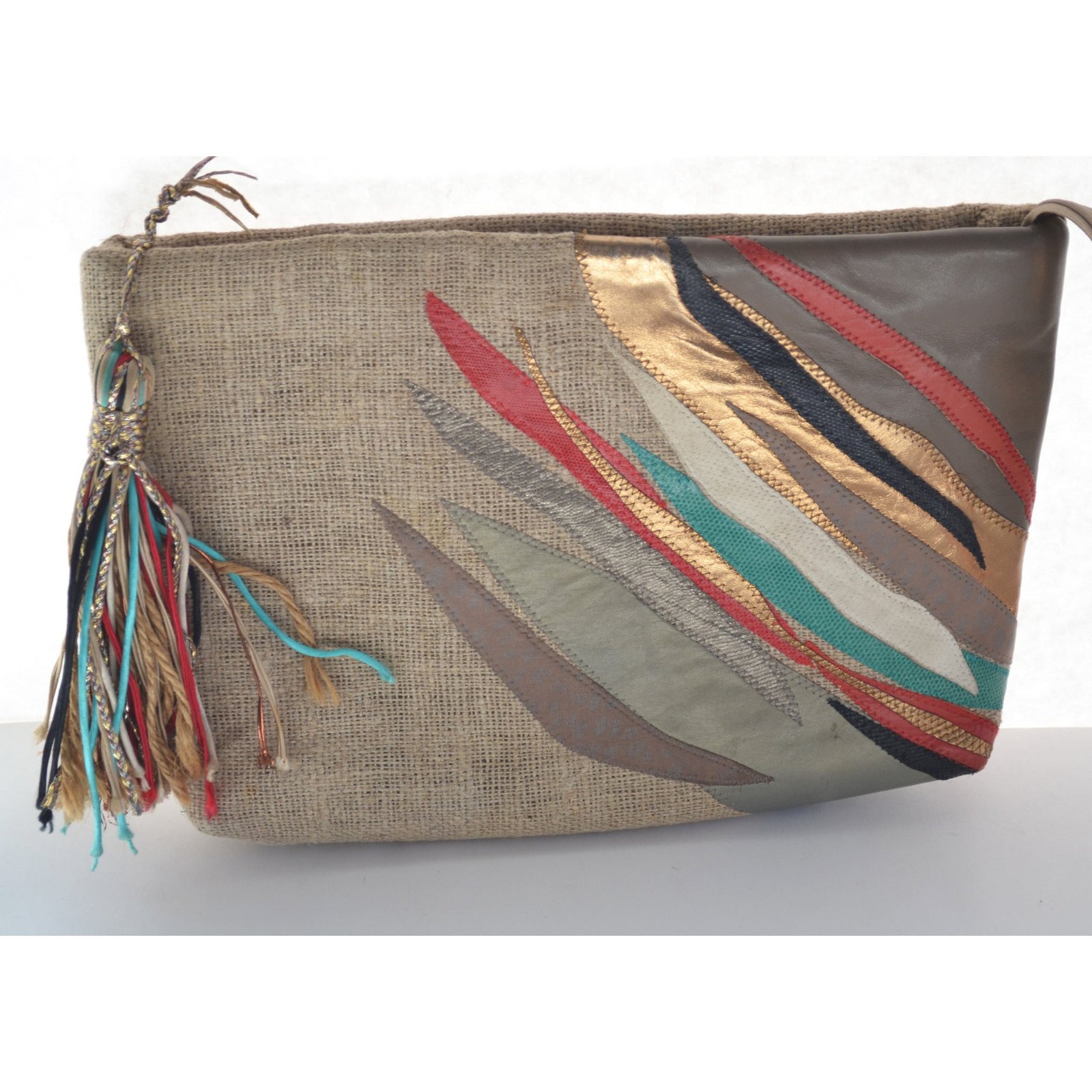 This oversized sexy vintage burlap clutch purse has colorful patch leather strips applied to the face. Has a multicolor tassel on the zip. Zip to closes. Interior is fabric lined with one pocket.
