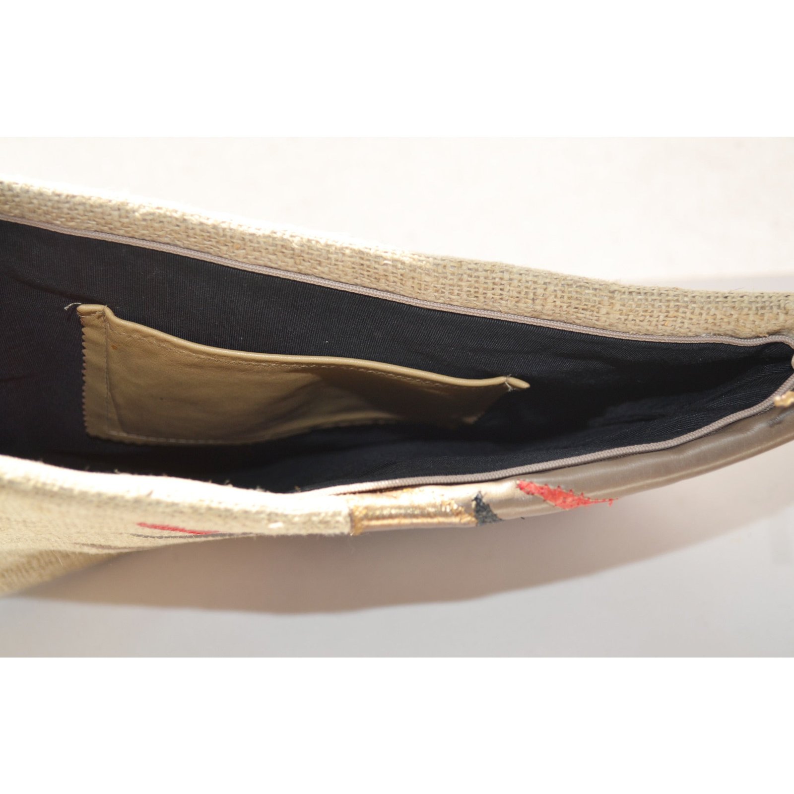 This oversized sexy vintage burlap clutch purse has colorful patch leather strips applied to the face. Has a multicolor tassel on the zip. Zip to closes. Interior is fabric lined with one pocket.