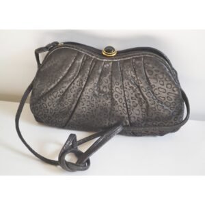 This embossed pleated black leather evening purse is from Tiras. Interior is fabric lined with two pockets (one zip). Has optional shoulder strap.