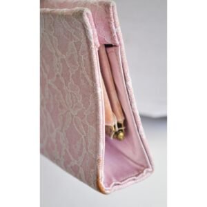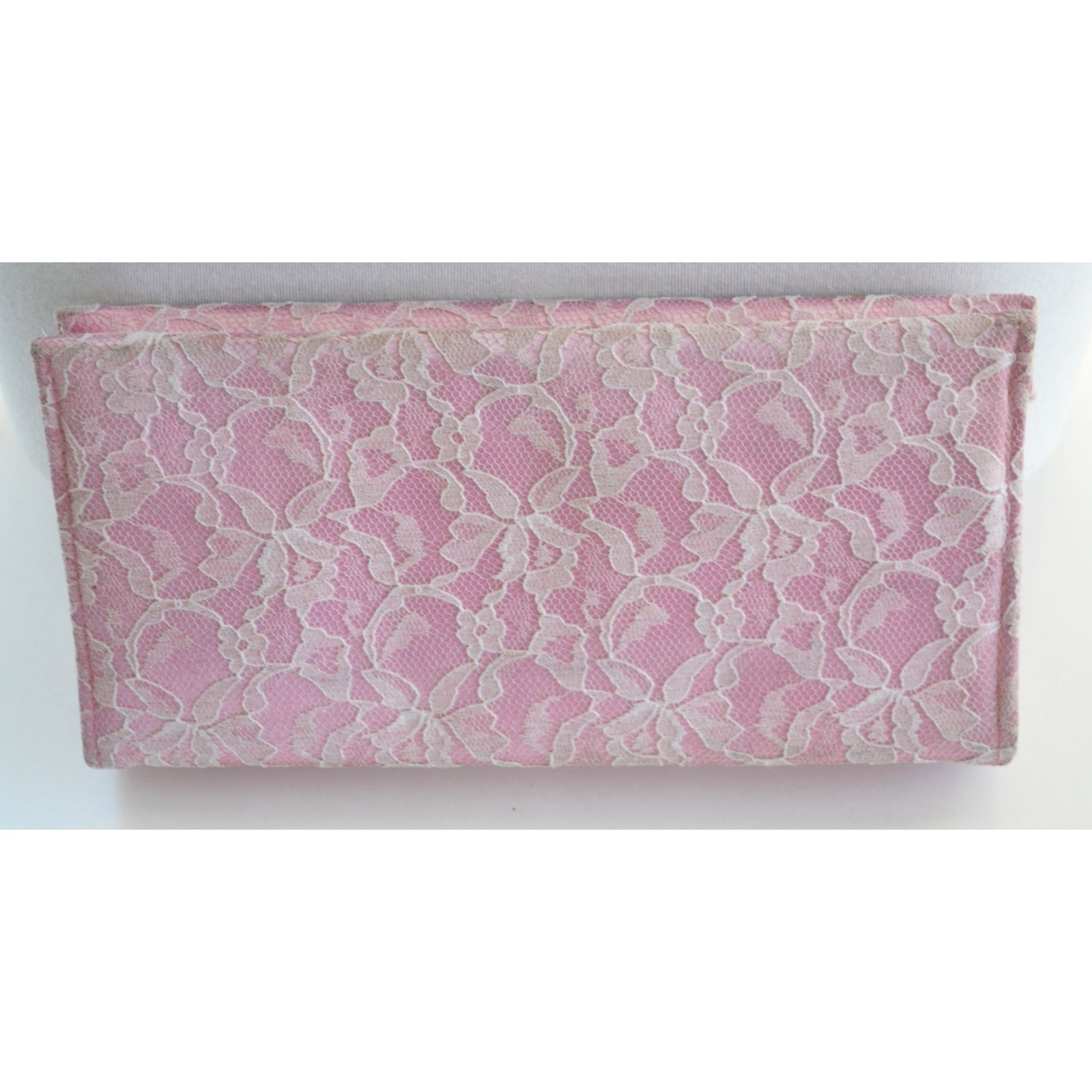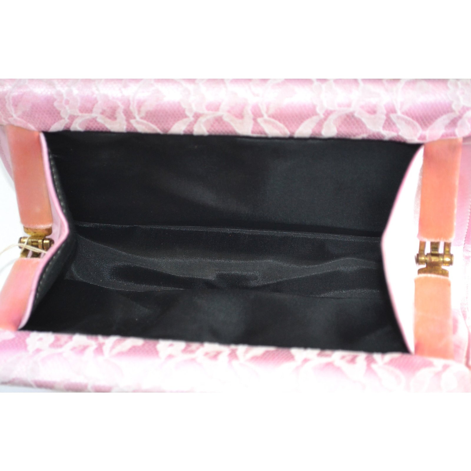 This sassy vintage pinkish satin cluth purse has lace overlay. The interior is lined with black fabric.
