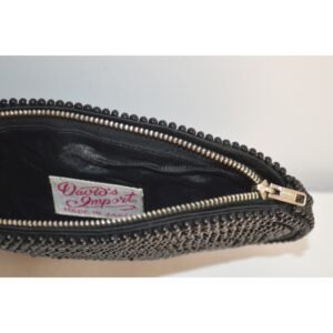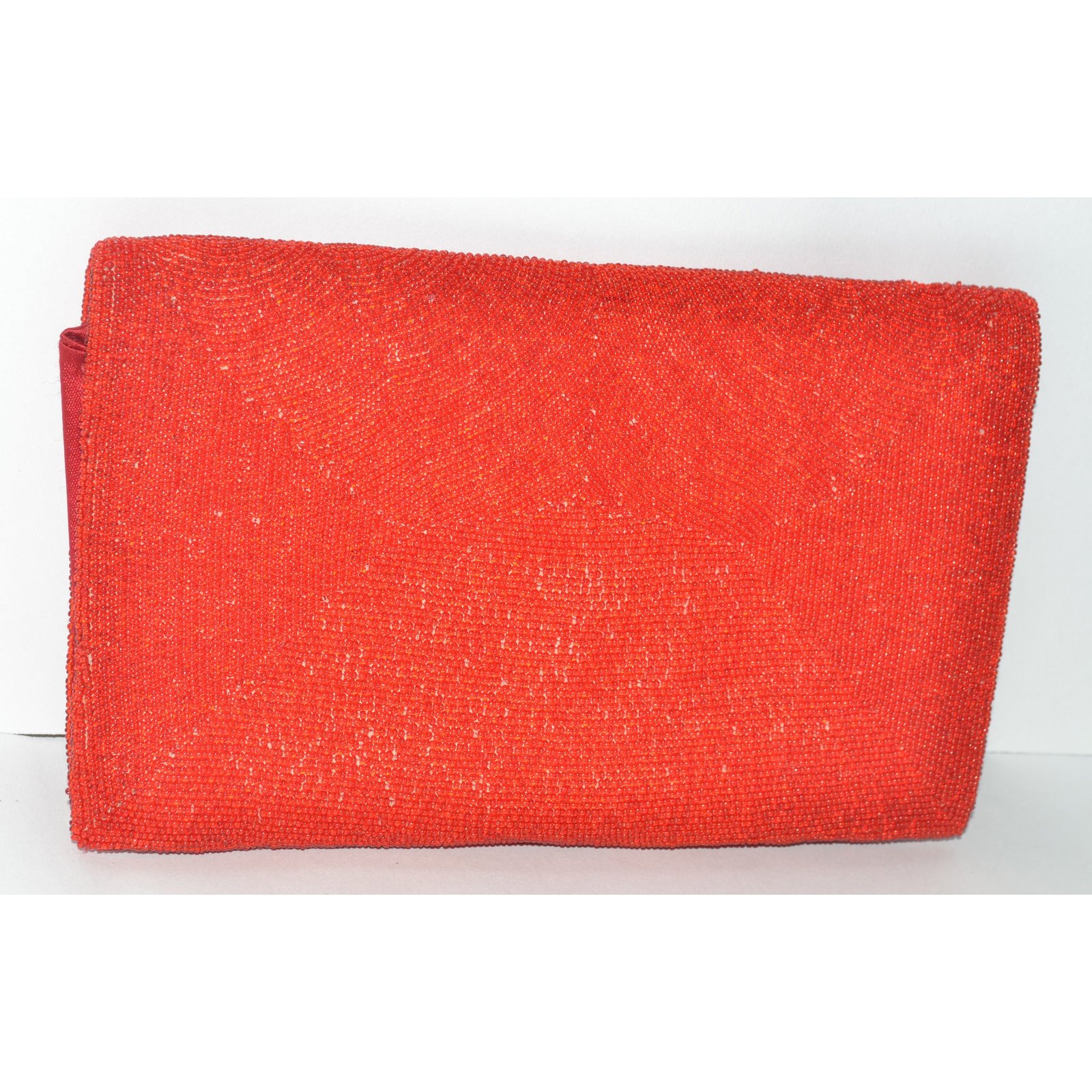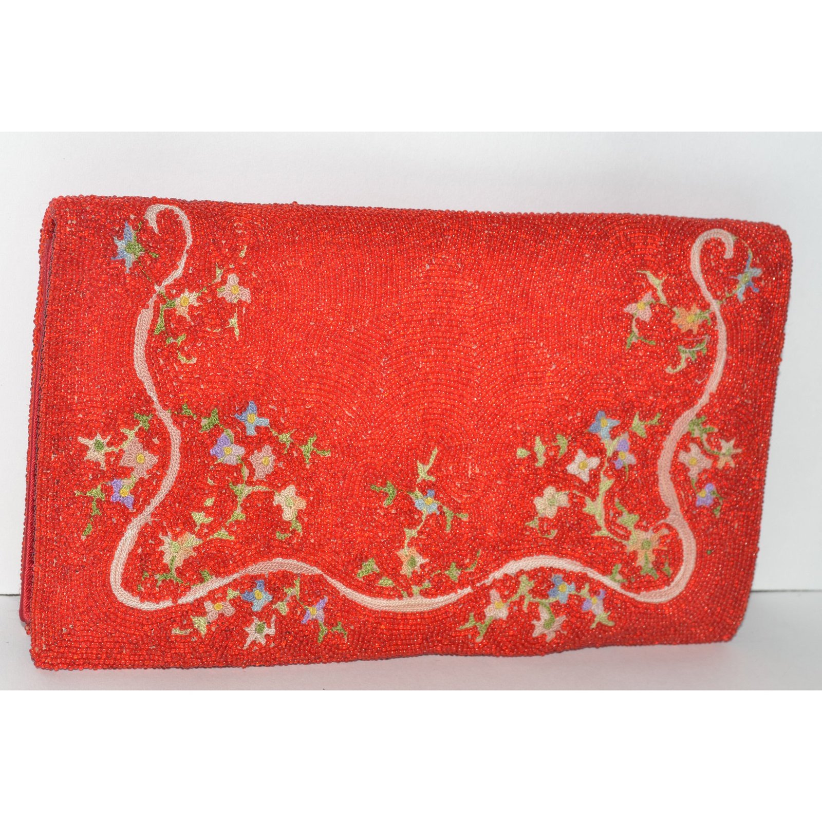 This vintage red beaded evening purse has floral embroidery on the face. Interior is fabric lined with 2 pockets.