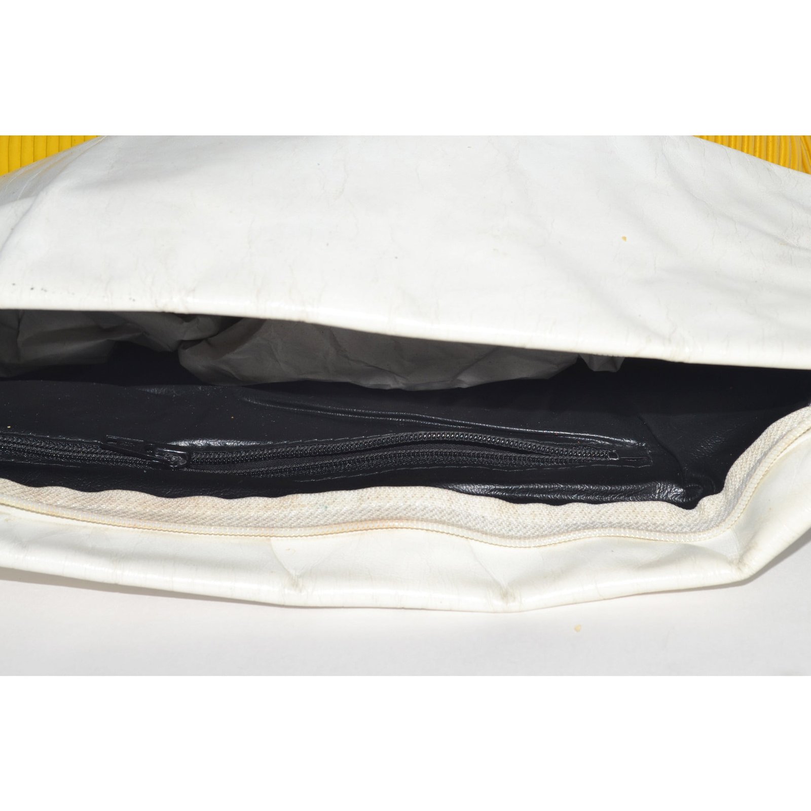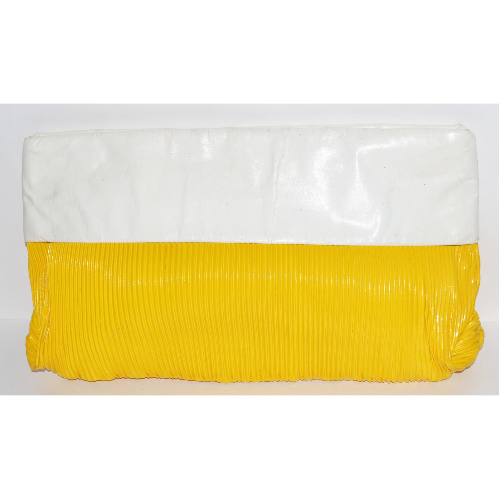 This vintage popping yellow & white ribbed clutch purse is made of vinyl and faux leather that folds over. Has one interior zip pocket.